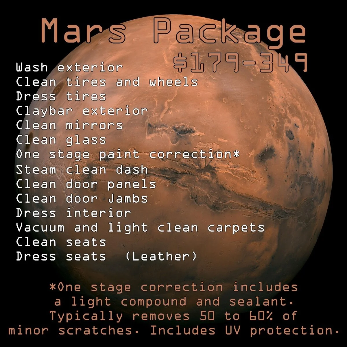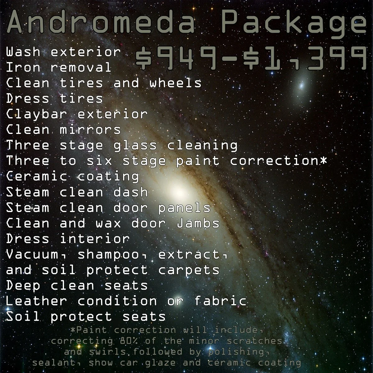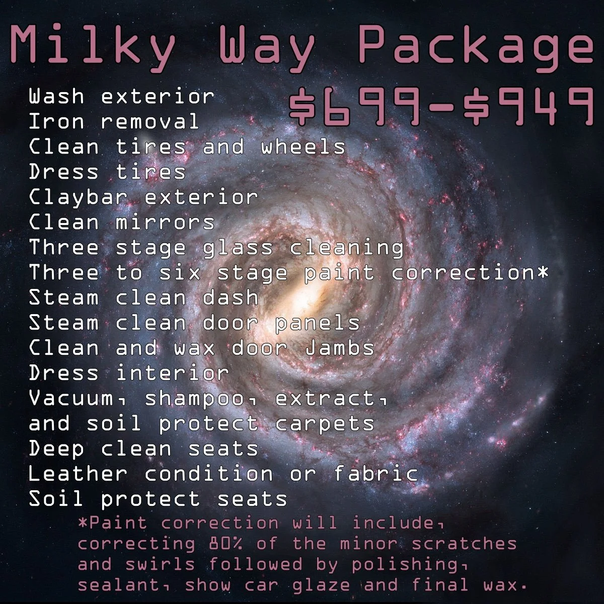 Designed for the enthusiast. This option is great for customers that own show cars, or cars that receive a special place in a garage. The Galaxy Style Packages offer the highest level of paint correction to achieve the top shine with the option of best protection. The focus of the Galaxy Style Package is to prepare a vehicle to a show level finish, while providing protection against UV damage as well. The Galaxy Style Packages can be customized to achieve the best results for the most discerning vehicle owner.